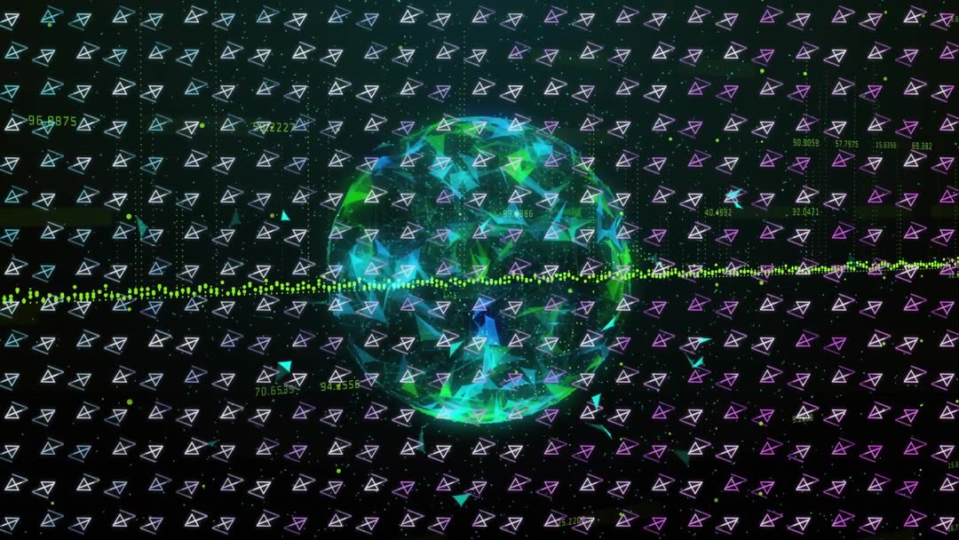 Captivating video depicting a digital sphere made from interconnected triangular grids, with a pulsating waveform and floating numbers, creating a cutting-edge data network effect. Ideal for use in technology presentations, digital network themes, futuristic cyber animations, or illustrating modern tech innovation.