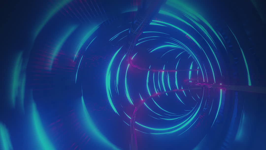 Visually compelling animation showing abstract lightning icons flowing inside a high-tech digital tunnel. Vibrant neon lights create a futuristic feel, suitable for tech presentations, background visuals at tech conferences, or as part of an interface-themed promo scene for cutting-edge software or game development demonstrations.