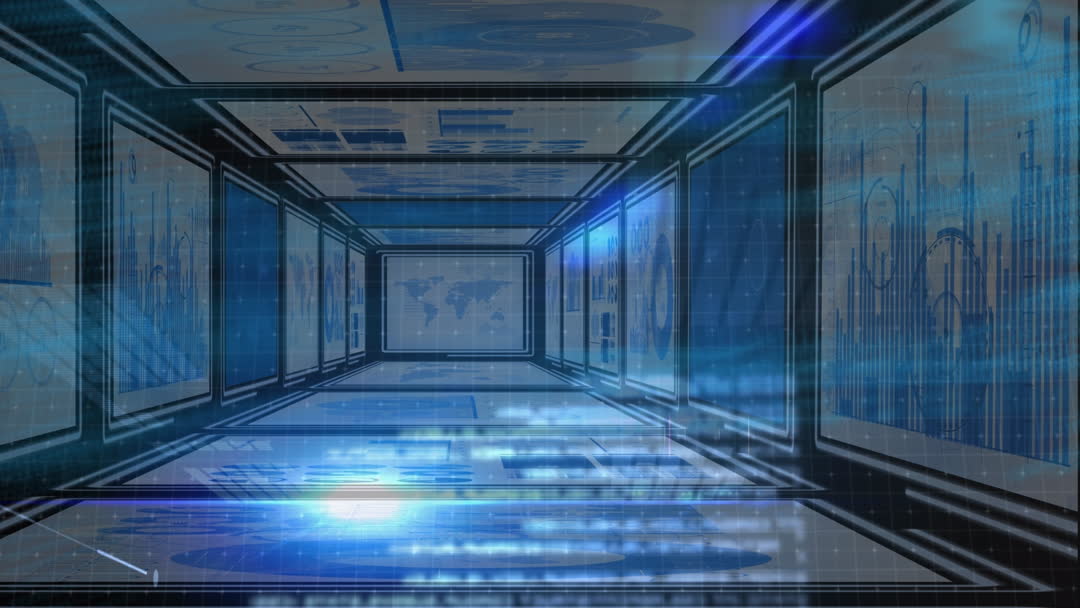 Image depicts a virtual tunnel composed of digital screens displaying diverse data visualizations, evoking themes of advanced technology and data processing. Ideal for illustrating concepts related to digital innovation, IT industry breakthroughs, or virtual environments in tech-related publications and multimedia presentations.