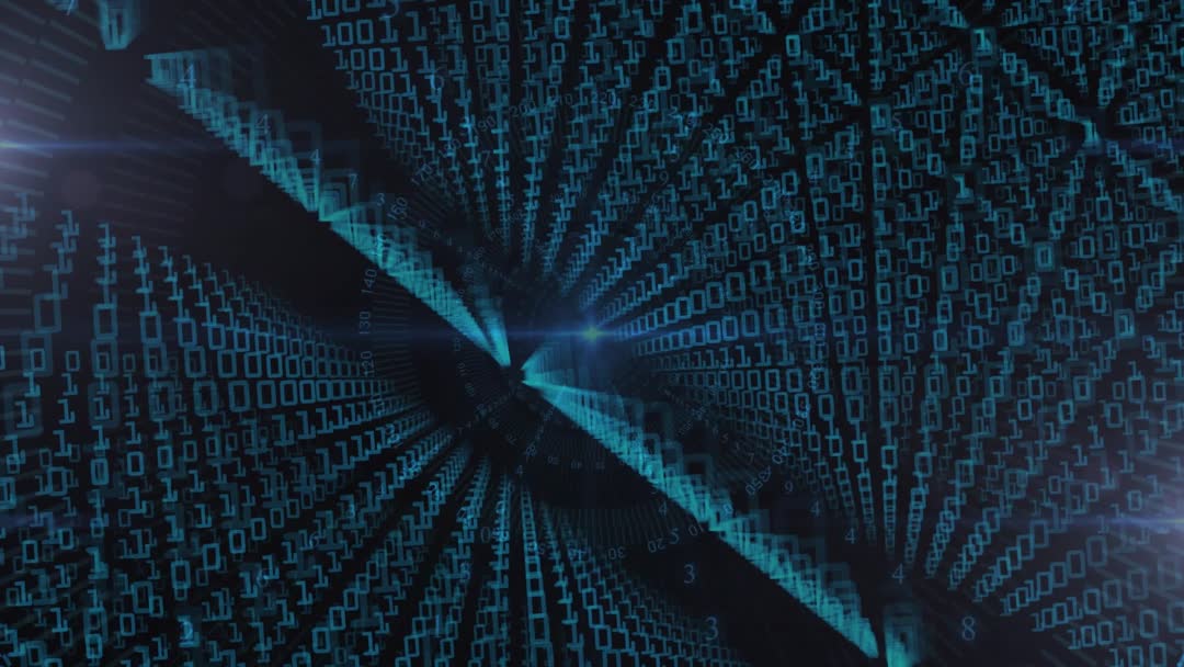 Dynamic portrayal of a digital tunnel filled with rotating binary digits, conveying a journey through cyberspace. This sequence embodies the concept of data transmission and connectivity in a cyber environment. Suitable for technology-related presentations or digital security concepts.