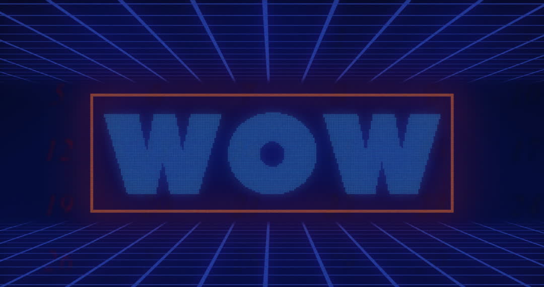 Vibrant WOW text in a futuristic digital style features a retro neon grid background. Ideal for social media posts, digital interfaces, technology-themed presentations, and design projects needing a high-energy, modern aesthetic.