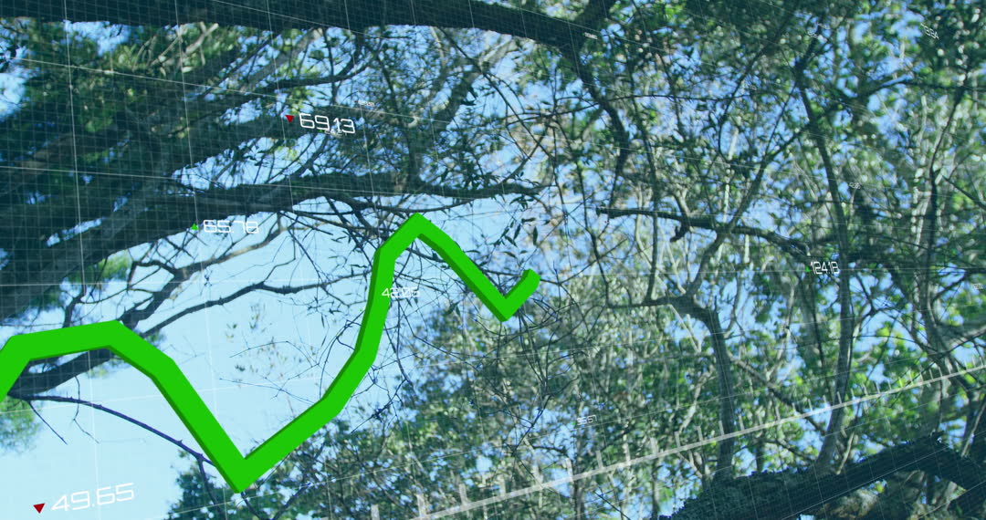 Conceptual representation showcasing juxtaposition of digital data charts overlaying natural setting. Suitable for themes about blending technology and environment, sustainability in finance, or growing trends in biotech sectors. It may be used in presentations, articles, and websites specializing in technology or ecological economics.