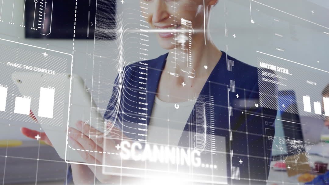 - Futuristic Display Over Woman Using Tablet for Data Analysis
