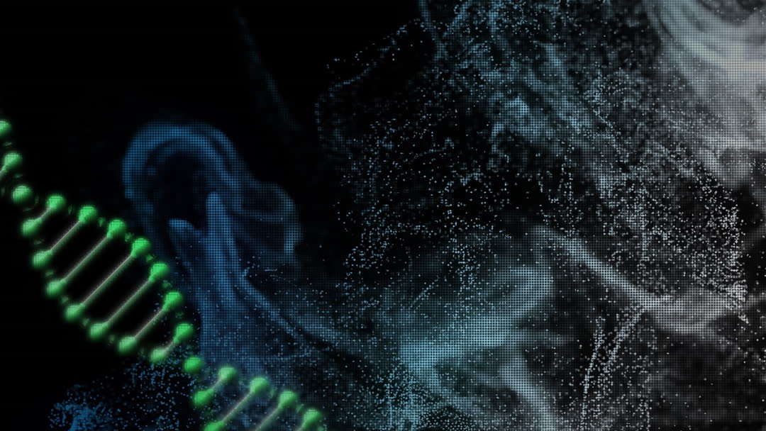 Digital animation showing floating particles alongside a DNA helix represents the intersection between genetics and data science. Perfect for technology blogs, genetic research presentations, or innovative branded content blending themes of science and modern technology advancements.