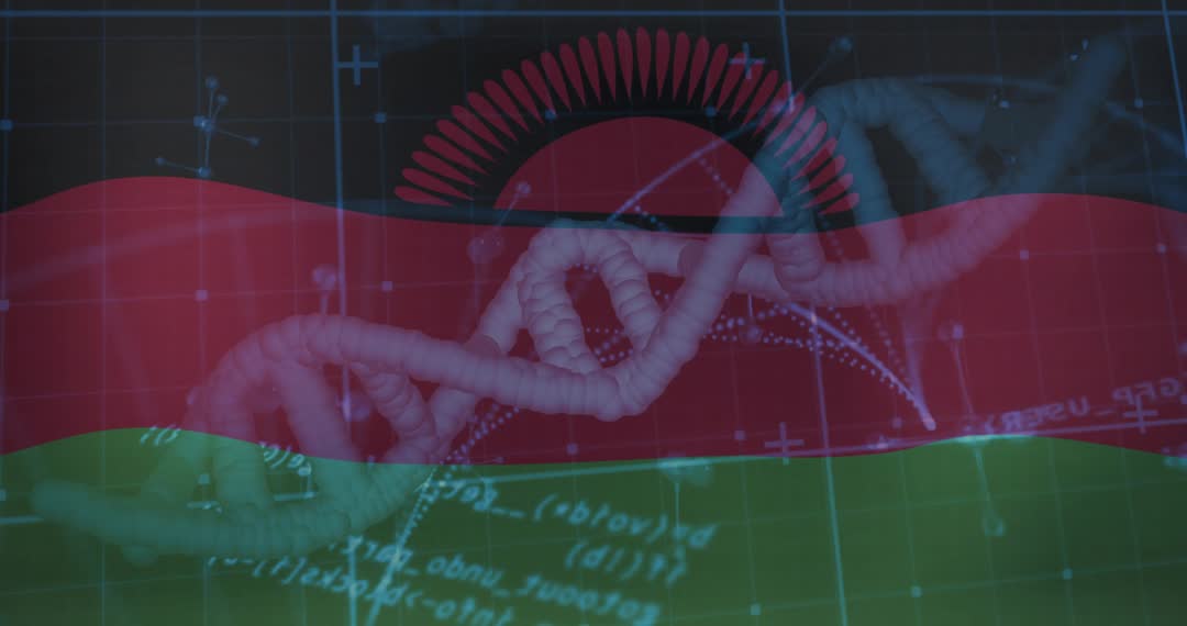 Abstract conceptual blend of molecular DNA structure overlies complex digital data on dark interactive map. Red, black and green horizontal bands enhance scientific visualization, reflecting global use for educational content, advanced research, or biometric and genetic studies around insightful data on health.