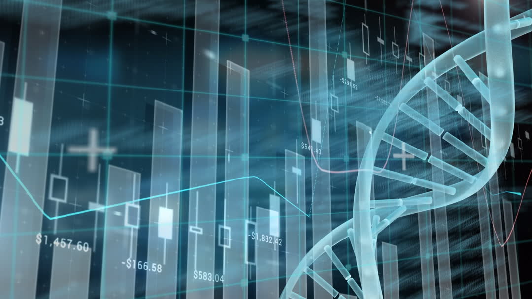 Futuristic DNA Strand Analysis with Data Graphs Background Video