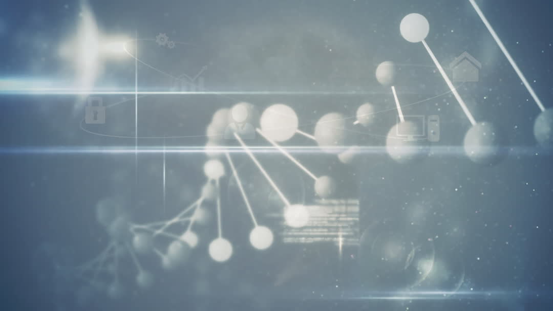 This futuristic animation showcases an abstract depiction of a DNA strand intertwined with data elements against a grey background. The blurred and simplistic forms lend a modern technological aesthetic, making it ideal for presentations related to biotechnology, digital networks, or futuristic design concepts. It may also be used in educational materials to illustrate complex themes in a creatively engaging manner.
