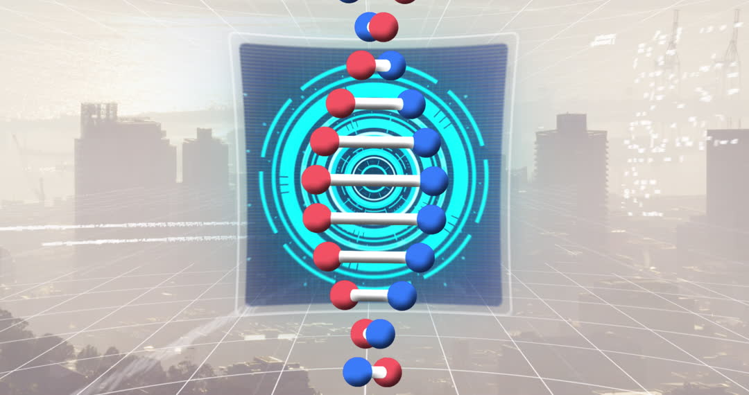 Visual shows a DNA strand integrating with a digital interface that overlays a modern cityscape. Ideal for illustrating concepts related to biotechnology, genomics, and the intersection of cutting-edge technology and urban development. It suggests innovation in genetic science and applications in a data-driven world, suited for articles, presentations on future technology, or educational materials.
