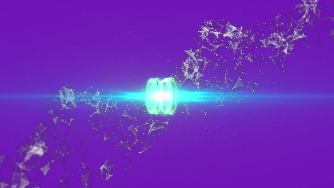 Digital video depicts a glowing DNA strand surrounded by fluctuating neon light spots against a purple background. Ideal for topics related to biotechnology, virtual interfaces, genetic research, and high-tech innovations in presentations or informational content.