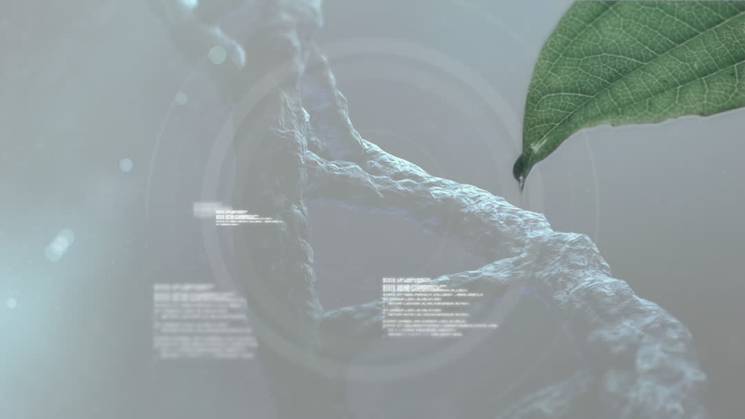 Visual combines elements of DNA structure and nature with biotechnology, blending science and technology themes. Ideal for illustrating concepts related to biotechnology, genetic research, ecology integrations, or innovative medical technology presentations.