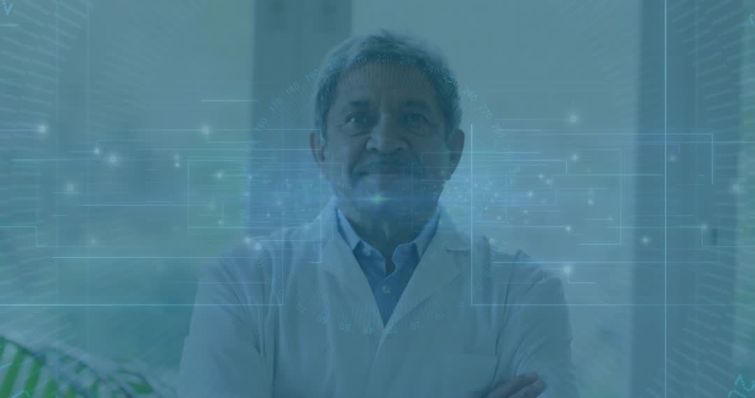 Doctor in white coat stands confidently against digital backdrop symbolizing technology and data analysis in medicine. Useful for illustrating concepts in medical innovation, health technology, or professional healthcare environments.
