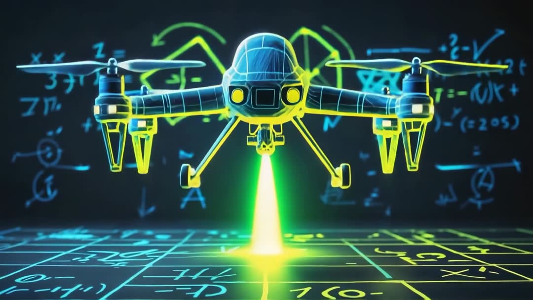 AI Generated Image. This illustration showcases a high-tech quadcopter drone emitting a green beam, hovering over a grid floor. Set against a backdrop of neon variable symbols and calculations, it creates an aura of futuristic innovation on technology. Ideal for use in sci-fi, technology, or AI-related content, this design emphasizes advanced concepts and cutting-edge digital tools.