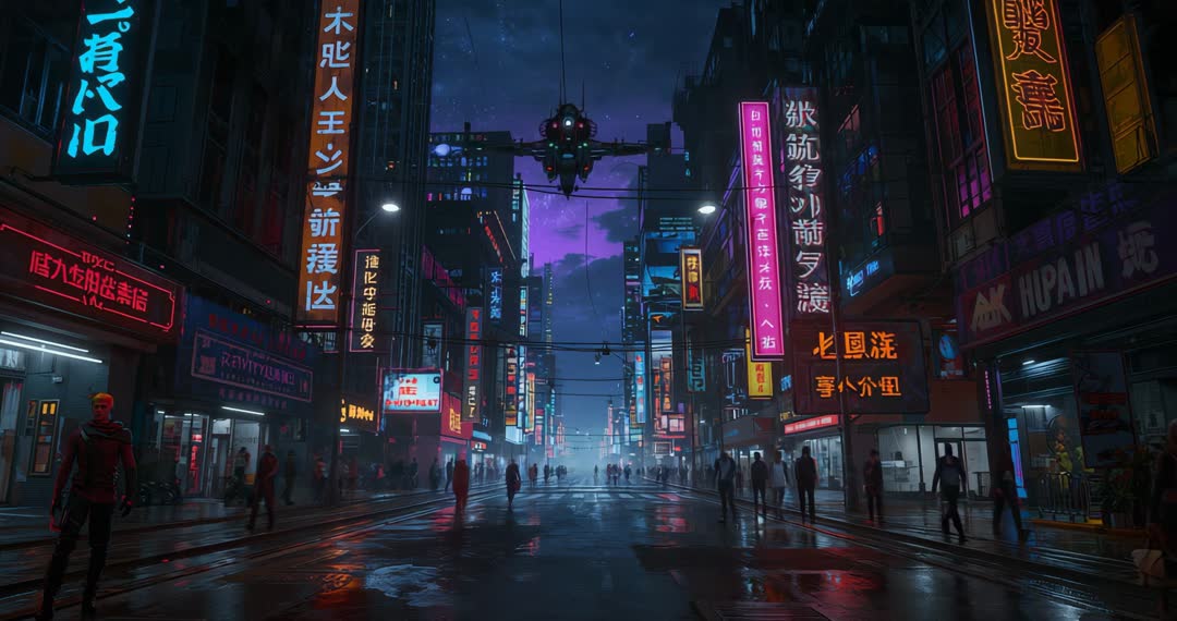 - Futuristic Drone Navigating Neon-Lit Cyberpunk Cityscape at Night