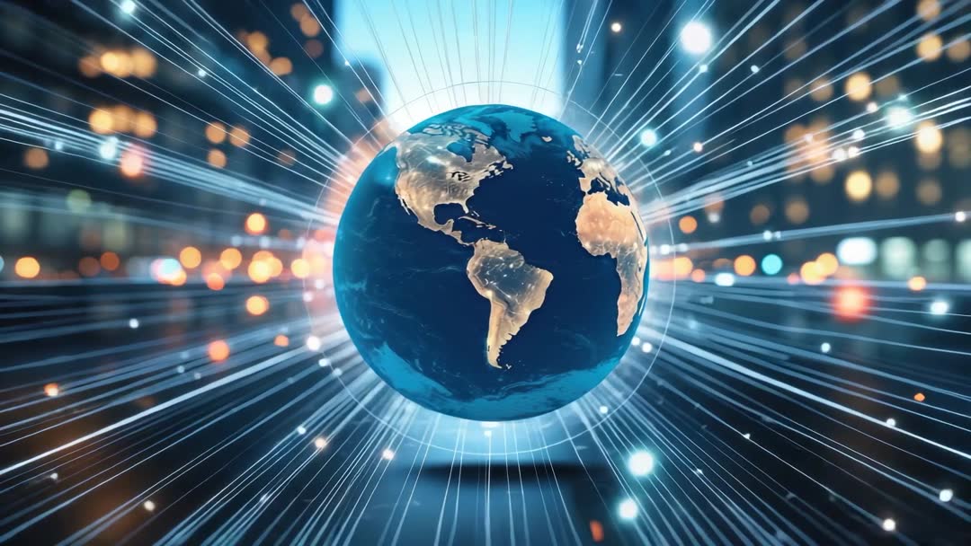 - Futuristic Earth with Radiating Light Beams in Digital Network Space
