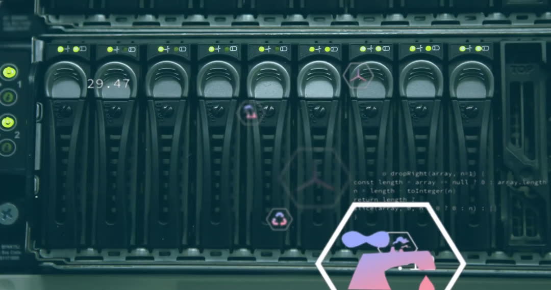 Animation showcases ecology symbols digitally overlaying server rack representing a blend of technology and sustainability. Ideal for use in presentations on green computing, illustrating concept of ecological awareness in digital environments. Useful for topics on digital sustainability and eco-friendly technology solutions.