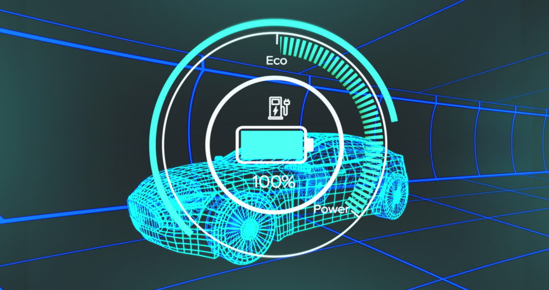 This digital illustration depicts a futuristic electric car design with a focus on the battery gauge representing eco power and sustainability. Perfect for conveying themes of technological advancement and environmentally friendly automotive innovation. Ideal for use in articles about electric vehicles, green technology, and modern automotive design.