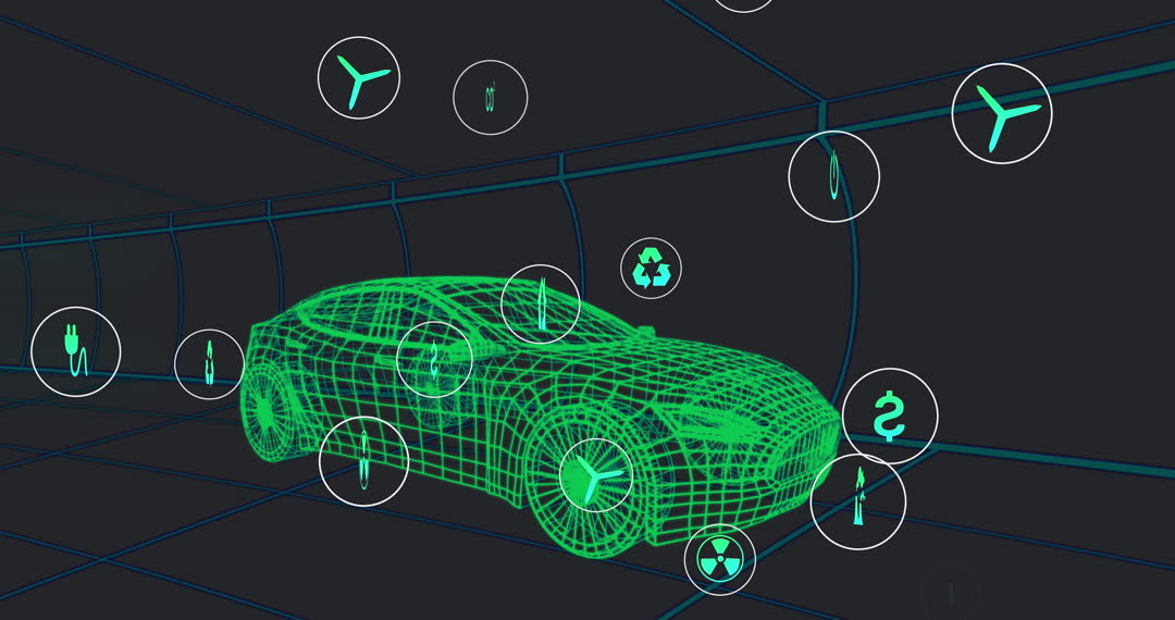 This visually striking digital graphic illustrates a 3D model of an electric vehicle surrounded by vibrant, dynamic digital icons within a sleek tunnel backdrop, emphasizing themes of sustainability and modern technology. Perfect for use in articles or presentations about electric vehicles, advancement in renewable energy, or future-focused sustainable transportation. The visual allegory can greatly enhance educational media or marketing materials centered on a tech-driven future.