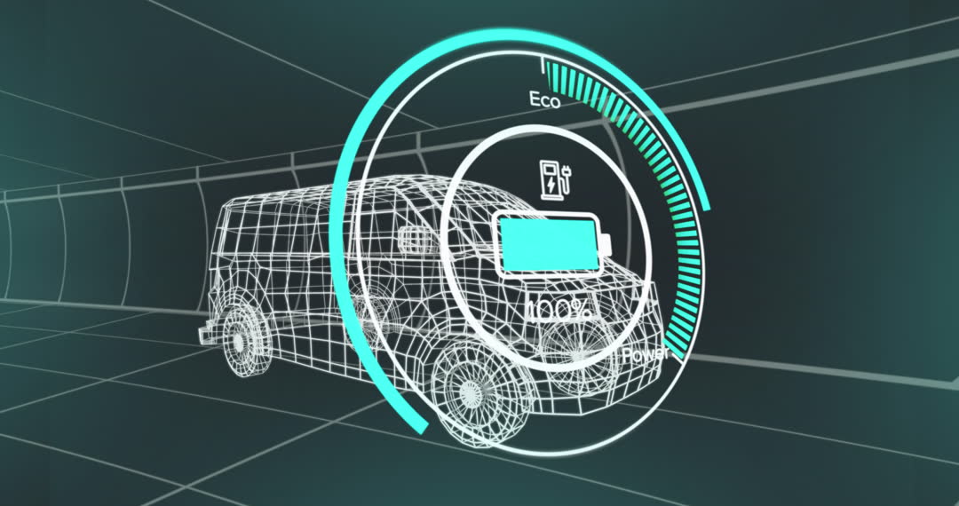 Visualizes digital transformation in the automotive industry, showcasing a wireframe electric vehicle with a futuristic battery and eco-mode display. Ideal for use in tech-focused automotive presentations, educational materials on electric vehicles, or as conceptual artwork in articles about the future of transportation.