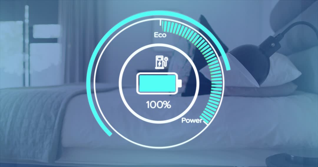 This digital energy gauge animation showcases the dynamics of a charge cycle, filling and emptying segments to indicate varying energy levels. Set against a contemporary bed setting with techno-aesthetic overlays, it illustrates the blend of modern home environment with sleek technology interfaces. Ideal for use in tech commercials, promotional videos on energy solutions, and presentations about smart home devices, highlighting advancements in battery management and electronic device integration.