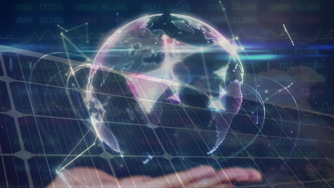 Visual of interconnected digital globe combined with stock market data and solar technology videos. Useful for representing the synergy between technology, financial markets, and renewable energy innovations. Suitable for business presentations, educational materials, or technological advancements in sustainability.