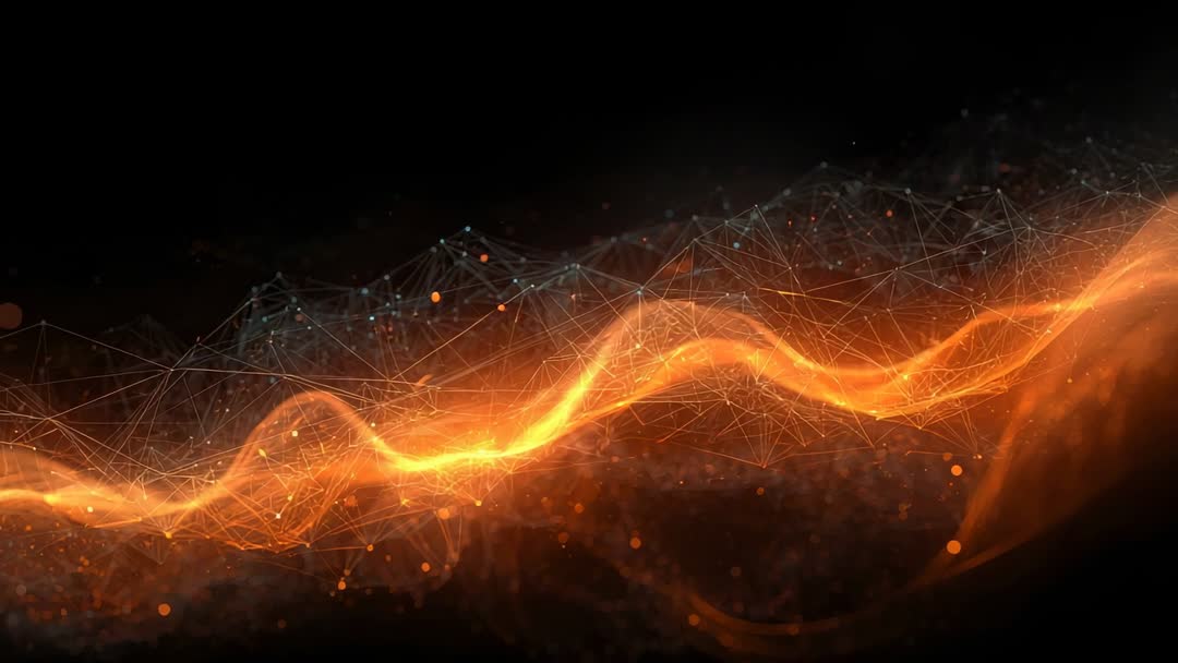 AI Generated Image. A vibrant orange energy ribbon undulates through a mesh-inspired digital landscape, emphasizing motion and transformation. Thirteen sparks appear to drift, highlighting the quantum-based possibilities. Ideal for use as a tech conference backdrop, digital promotion, or creative AI representation.