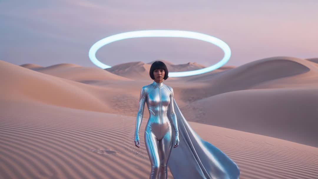 AI Generated Image. This fantastical scene showcases a futuristic explorer in a sleek metallic suit traversing serene desert dunes, signifying cosmic discovery and adventurous exploration. The glowing neon ring adds a mysterious sci-fi element, ideal for concepts around otherworldly travel, digital artwork, or genre cross-overs like science fiction and fantasy. Perfect for editorial projects, websites focusing on future technology, or visual narratives in film and gaming.