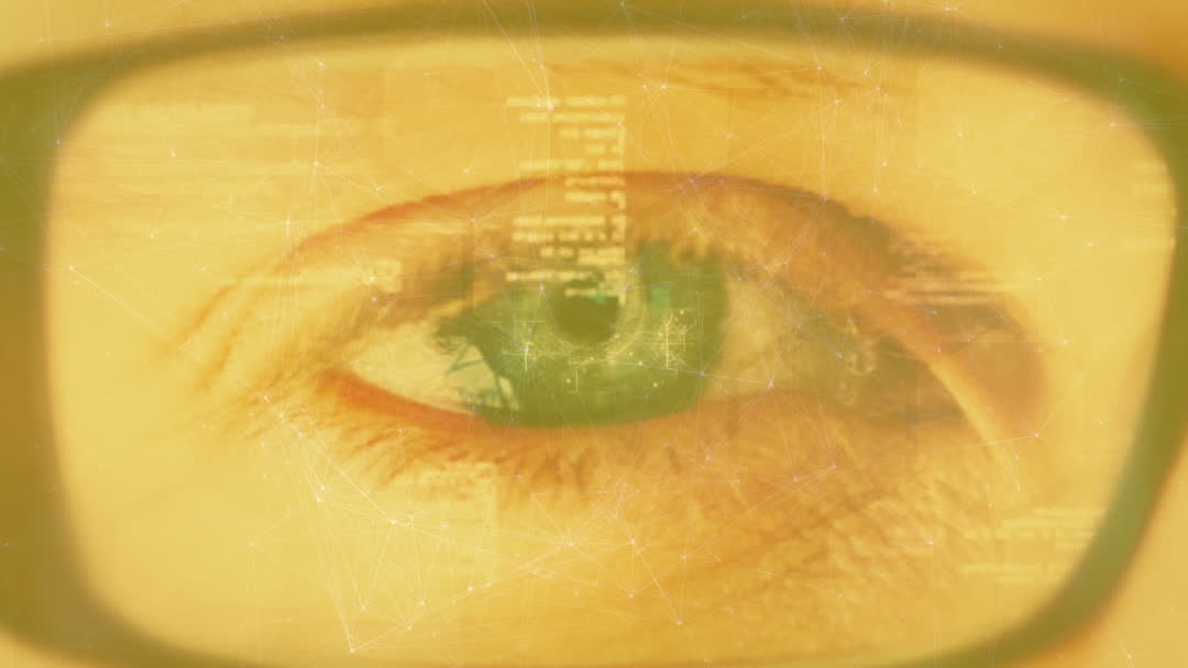 This imaginative depiction highlights an eye viewed through eyeglasses with digital data overlays. Ideal for showcasing concepts of technology, communication networks, data analysis, and augmented reality. Suitable for tech-related articles, digital marketing presentations, or as a metaphor for vision and insight in business contexts.