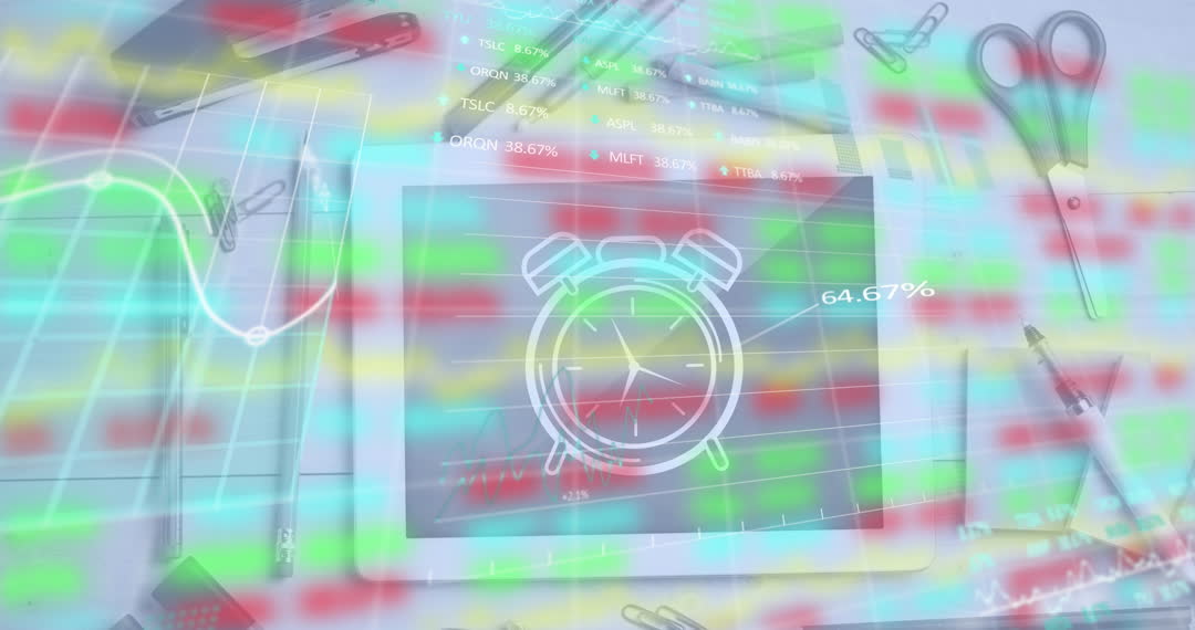 This composition blends financial data visuals with educational symbols, suggesting the intersection of finance and learning. The mingling of digital graphs, tablets, and stationary items symbolizes how technology enhances time management and financial understanding in education and investment fields. Ideal for illustrating concepts in fintech, e-learning platforms, or modern educational practices enhanced with technology.