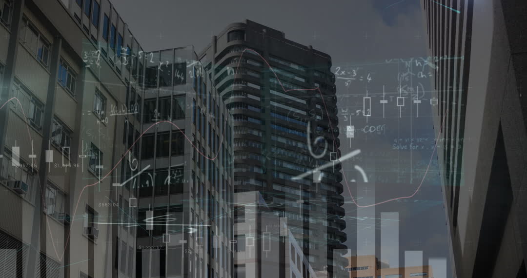 Digitally generated visuals displaying statistical data and mathematical equations overlaying a cityscape of tall skyscrapers, representing concept of advanced financial analysis. Ideal for illustrating sophisticated methods in global business strategies, technology in urban development, and enhancements in data-driven financial planning.