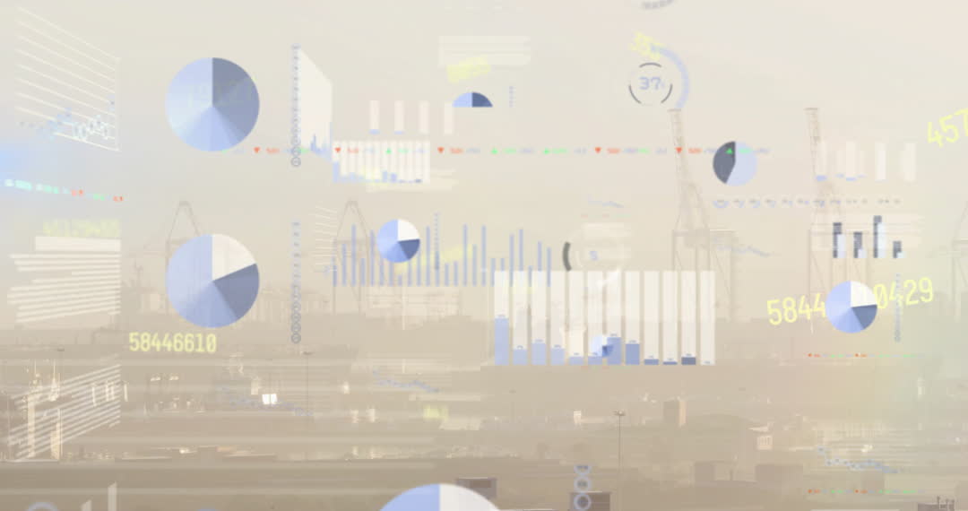 Complex patterns of animated financial data and charts are overlaying a blurred city location. This visualization is ideal for presentations or projects related to business intelligence, finance, or technology, enhancing themes of innovation, data analysis, and global connectivity.
