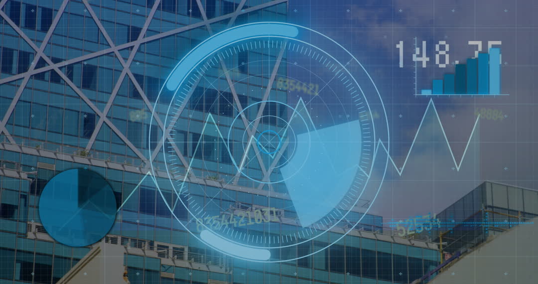 Futuristic visualization of financial data projected onto an office building, featuring processing circles and chart graphics. Ideal for presentations on technology-driven markets, finance applications, investment resources, analytics software promotions, or economic forecasts.