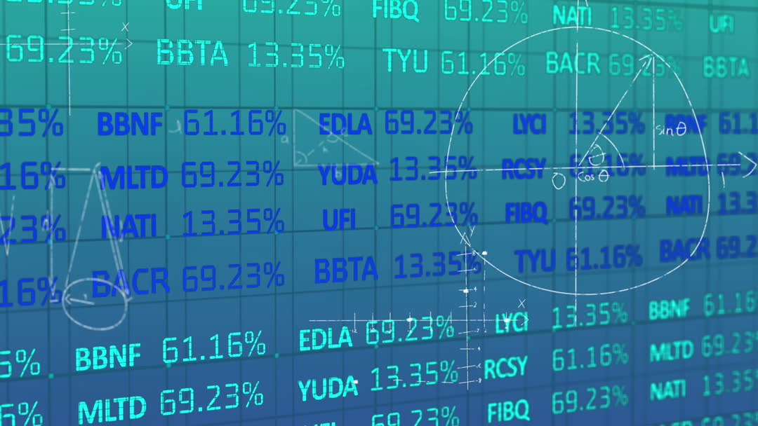 Dynamic illustration of financial market statistics overlayed with abstract mathematical animations creates a complex, futuristic feel. Suitable for use in presentations or publications about finance, investment strategies, or economic trends.