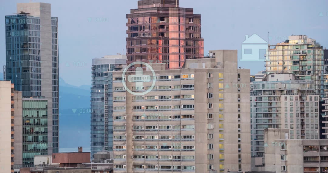 Capturing a modern urban skyline with icons and financial data superimposed, creating an atmosphere of digital progress and economic activity. Ideal for use in articles about financial analytics, global business, real estate markets, and technology in urban development.
