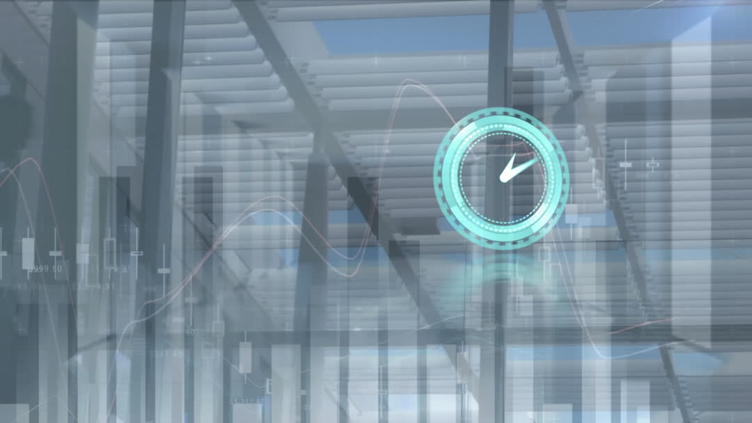 Digital art depicts dynamic financial data processing with a fast-moving clock symbolizing efficiency and innovation. Elements like charts and digital signals interweave through a modern glass architecture background. Suitable for use in presentations or themes related to fintech, technological advancements, innovative business solutions, or global data analytics.