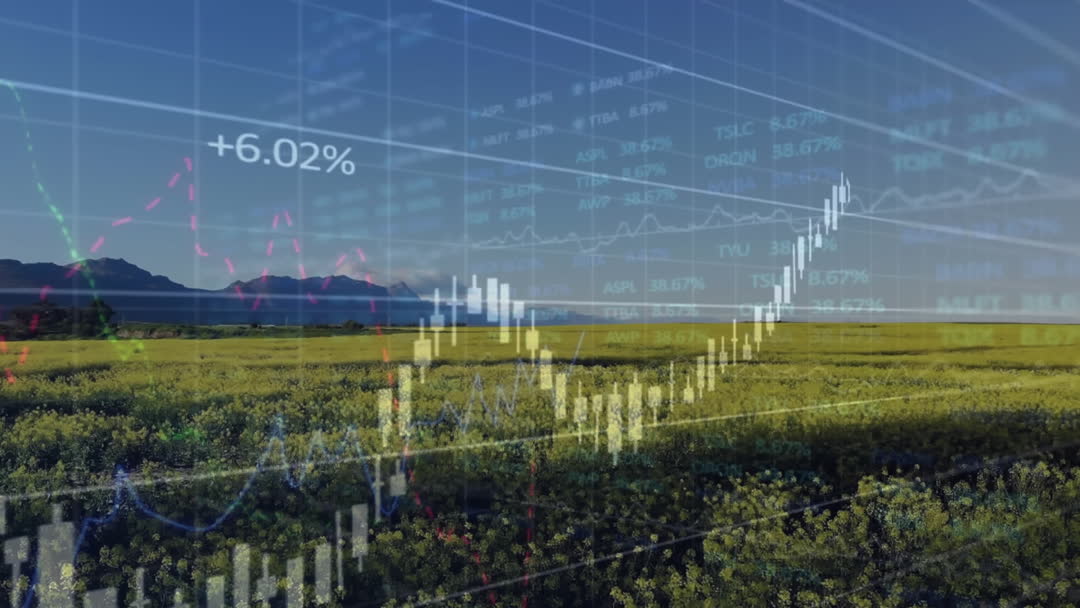 Combining elements of finance and nature, this video shows digital financial data graphs layered over a lush agricultural field. The upward-trending graphs and numerical indicators highlight themes of business growth, investment success, and economic progress. Ideal for use in presentations, websites, or reports focusing on the intersection of technology and agriculture, economic trends, and industry development.