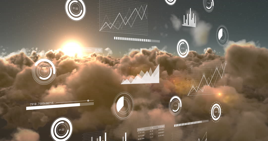 Visualization of 3D financial graphs superimposed over a vibrant sunrise, emerging from thick clouds. The video symbolizes technological advancement in finance, with a focus on global networks and data processing. Suitable for financial tech promotions, investment guides, and conceptual representations of innovative financial solutions.