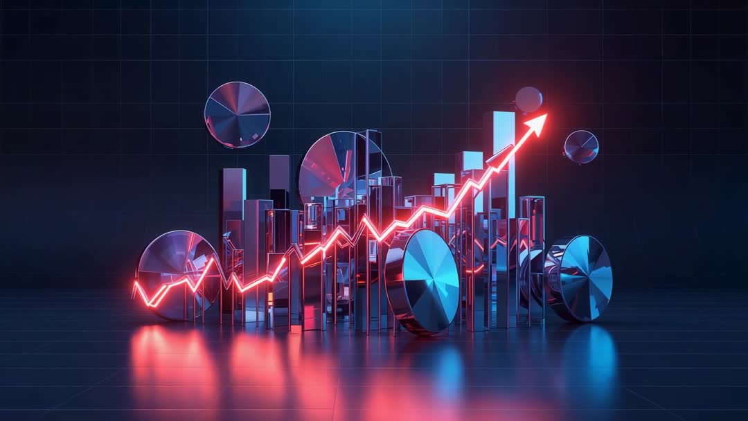 AI Generated Image. This digital visualization depicts financial growth using advanced 3D metallic bar and pie charts with a neon red line showing upward trends. The glowing red arrow represents positive financial or stock market trends, perfect for illustrating market analysis and innovation themes. Use this for presentations, business reports, or data analytics visualizations.