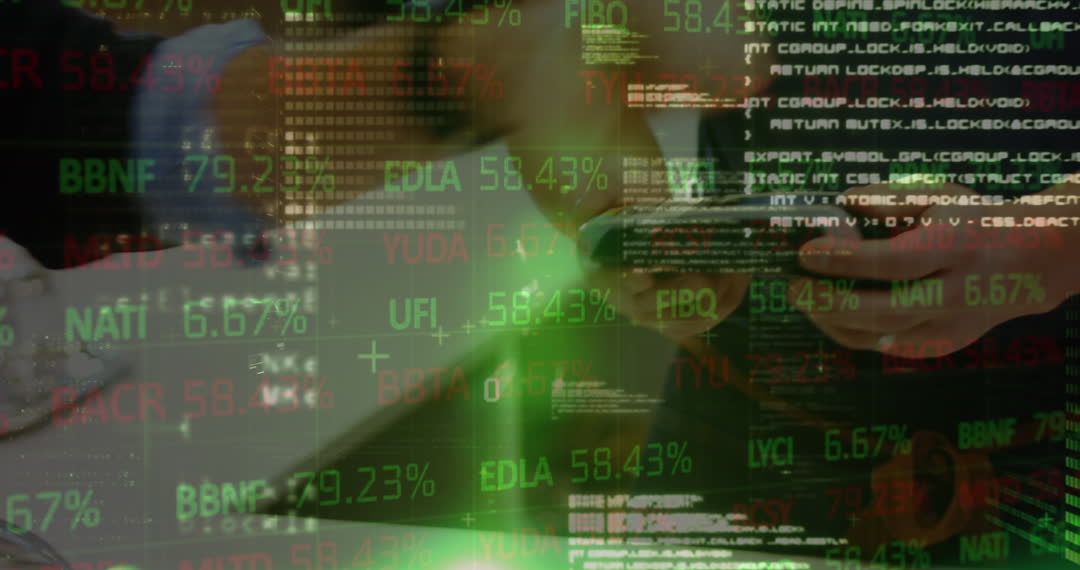 This visually engaging representation showcases integration of technology in everyday transactions with a futuristic vibe, combining stock market data with modern payment technology. Ideal for illustrating articles or presentations about fintech innovations, cashless economies, or the future of financial transactions. Useful for blogs, educational purposes, or marketing materials targeting tech-savvy audiences.