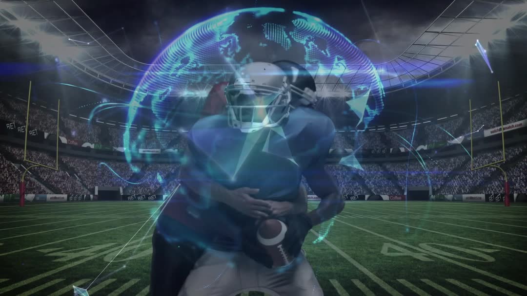 Dynamic video capturing an intense football scene high in action and adrenaline. The teal player skillfully executes a pass-associated catch, while rival from red team intercepts at crucial moment. Digital globe projection adds innovative, futuristic touch, rendering this particularly appealing for presentations on advances in sports technology, strategic games or virtual reality athletics. With packed stadium applauding in background, film serves ideal operations and publicity material relating modern sports analytics and dynamic athletics videos.
