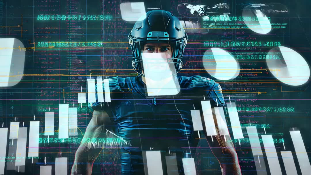 AI Generated Image. Helmeted footballer in digital environment, surrounded by data charts and code, depicting use of technology in sports analytics. Ideal for topics on sports technology innovations, performance analysis, and the future of athletics. Perfect for educational materials, tech company presentations, or sports analytics discussions.