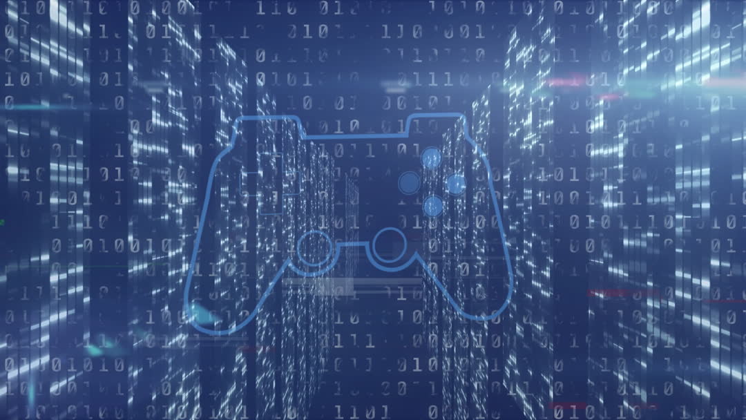 Digital animation showcasing a gamepad icon overlaying moving binary code, symbolizing technology and innovation within the gaming industry. The blue tones convey a tech-driven, futuristic theme. Suitable for use in technology articles, gaming presentations, and digital transformation topics.