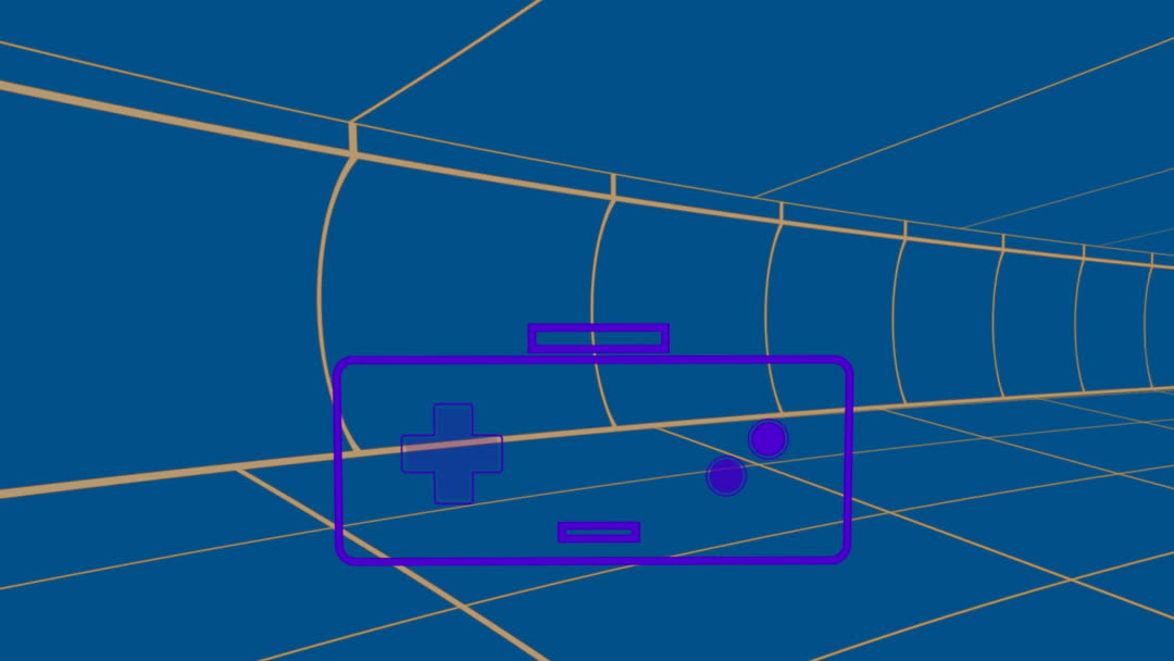 Abstract design featuring a translucent gamepad hovering in a digital tunnel-like space. Blue and gold lines create a sense of motion and dynamism, suitable for tech and digital-related themes. Ideal for use in gaming promotional materials, technology reviews, entertainment content, and virtual reality concepts.