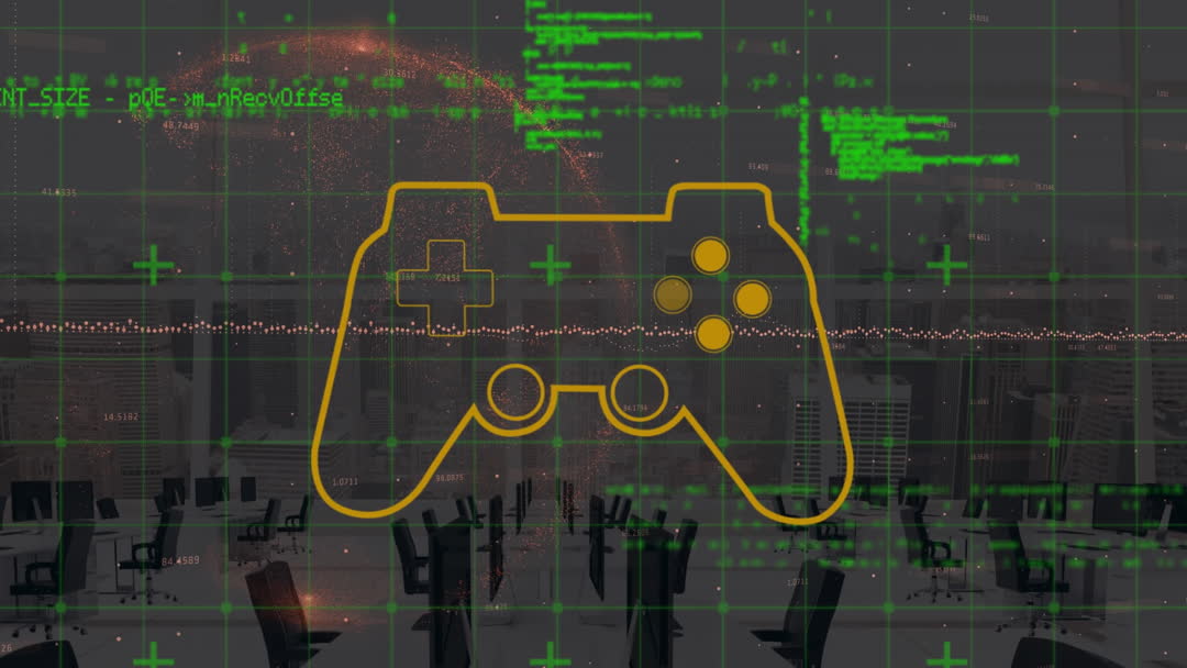 A glowing gaming controller amid digital code represents the intersection of gaming technology and data networks. Perfect video for illustrating futuristic gaming industries, coding enthusiasts, or articles about gaming technology advancements. Ideal for use in blog posts, websites, or technology presentations about digital gaming or coding culture.