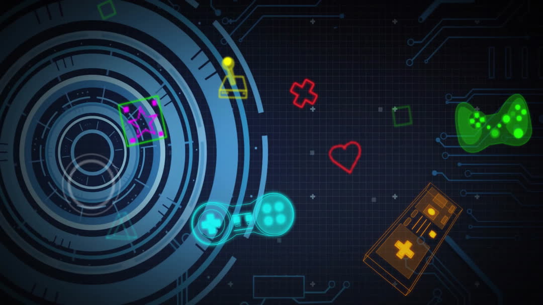 A colorful, animated VGA-era video game-inspired background perfectly suited for tech and gaming-related content. This dynamic visual displays classic video game icons gliding across the frame with a sophisticated scanning scope interface overlay. Use this striking representation to enhance video game cartridges, electronic presentations, digital advertisement brainstorms, or online media focused on retro gaming graphics.