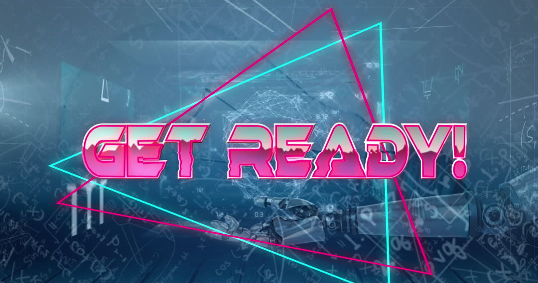 Perfect for tech-centric projects, this futuristic banner features neon get ready text juxtaposed with a robotic hand and mathematical equations. Use it for technological, educational, or gaming events to convey innovation and preparation.