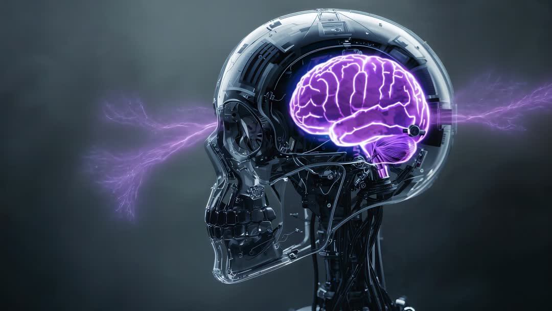AI Generated Image. This video frame illustrates a technologically advanced portrayal of a glass skull housing a vivid purple brain view surrounded by electric arcs, highlighting a concept of enhanced intelligence or digital innovation. It presents videory ideal for tech, science fiction, or AI-related media that invoke themes of progress in neuroscience. Could be utilized for illustrating concepts in futuristic technology and cybersecurity laced with modern and digital aesthetics.