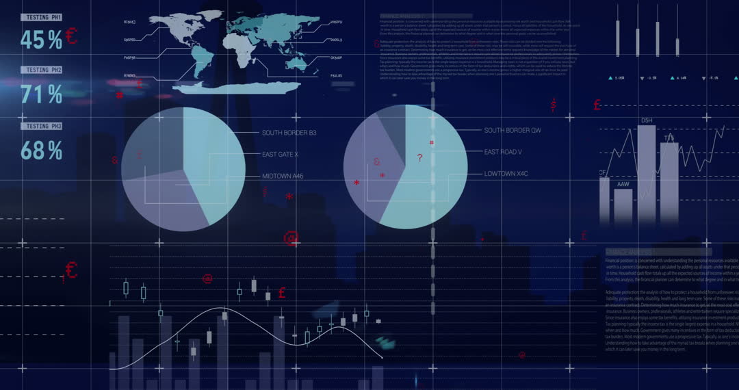 Visualizing a complex network of global data and analytics with futuristic digital interfaces. Bar charts, graphs, and pie charts displaying international business statistics across various metrics like percentages and regions. World map symbolizing global connectivity and access. Useful for illustrating themes of international business, digital technology, big data, and analytics in presentations, articles, and tech-related content.