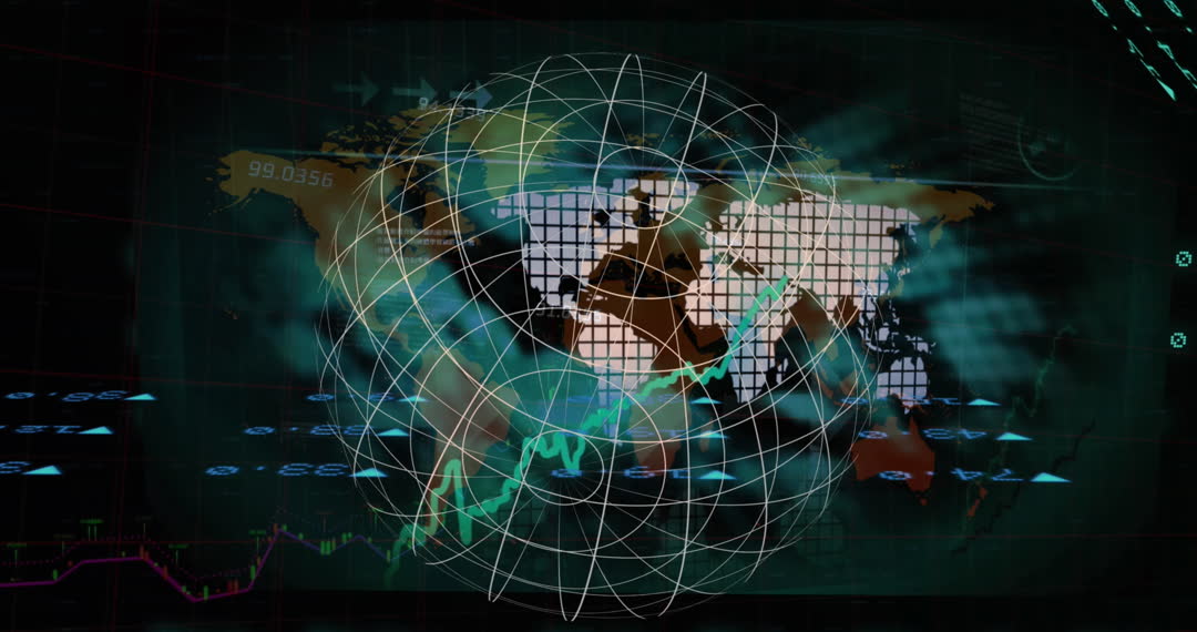 This digital animation showcases a sophisticated design of interconnected global data. It overlays a world map and a virtual globe with technology-inspired graphics. Ideal for illustrating themes related to global economy, business strategy, and modern technology in articles, presentations or reports on international trade and data analysis.