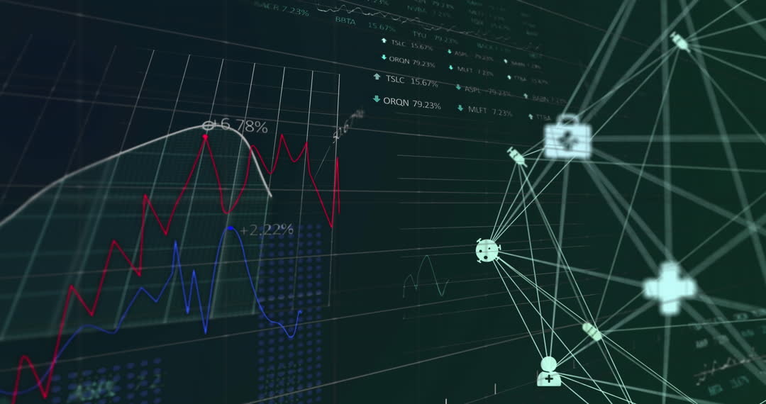 This video shows interconnected medical icons overlaid on stock market data and graphs. Suitable for illustrating topics that merge healthcare with finance technology, digital transformation, or investment in medical innovations. Ideal for business presentations, health tech articles, or economic forecasts.