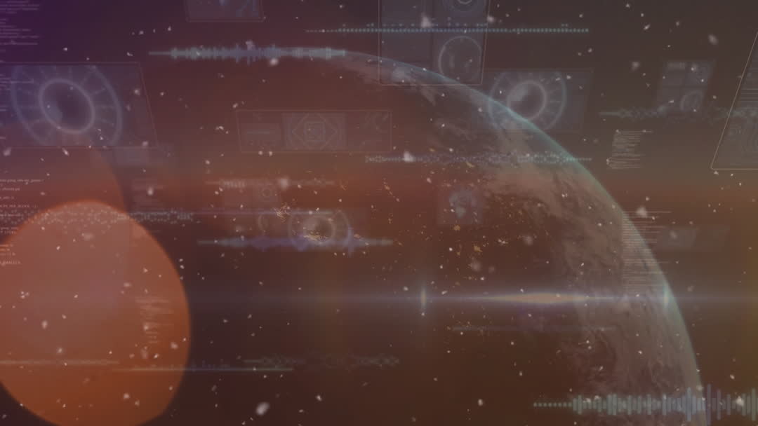 Visual depicting advanced digital interface overlaying a globe, symbolizing interconnected global network and technological advancement. Suitable for use in presentations about digital innovation, technology trends, data visualization, and global business strategies. Ideal for illustrating concepts in cybersecurity, virtual networking, or futuristic communications.